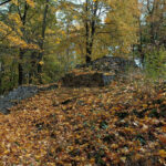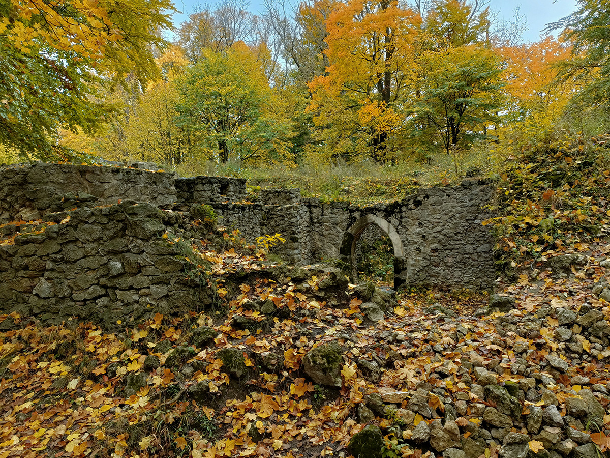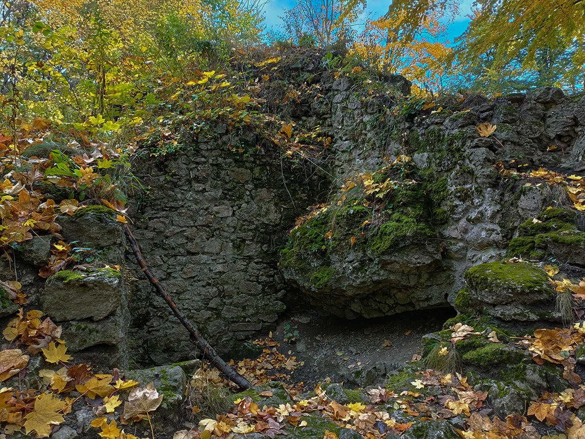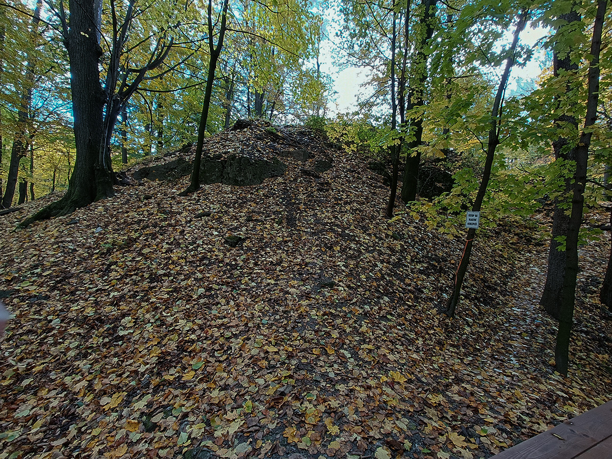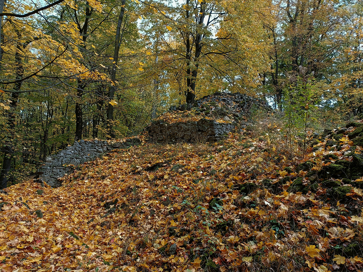 Ok. 250 metrów za Stadionem Emila Zatopka dostępny jest parking przed wejściem do lasu. Potem wchodzi się na asfaltową ścieżkę prowadząca pod górę, w kierunku ruin zamku Šostýn. Potem jeszcze kolejny etap, czyli leśna dróżka wyłożona dywanem z jesiennych liści. Oczywiście pod górę. W ten sposób doszedłem do niewielkiego stawu zamkowego (Hradní rybník). Stamtąd pozostało podejść, oczywiście pod górę, do ruin zamku. Najpierw znalazłem stosy kamieni. Potem okazało się, że należy przejść na kolejną górkę, gdzie pojawiają się jakieś resztki murów. Do najciekawszego miejsca trzeba było zejść w dół. Tutaj został największy fragment, nieco zrekonstruowany.