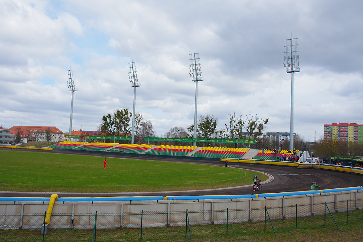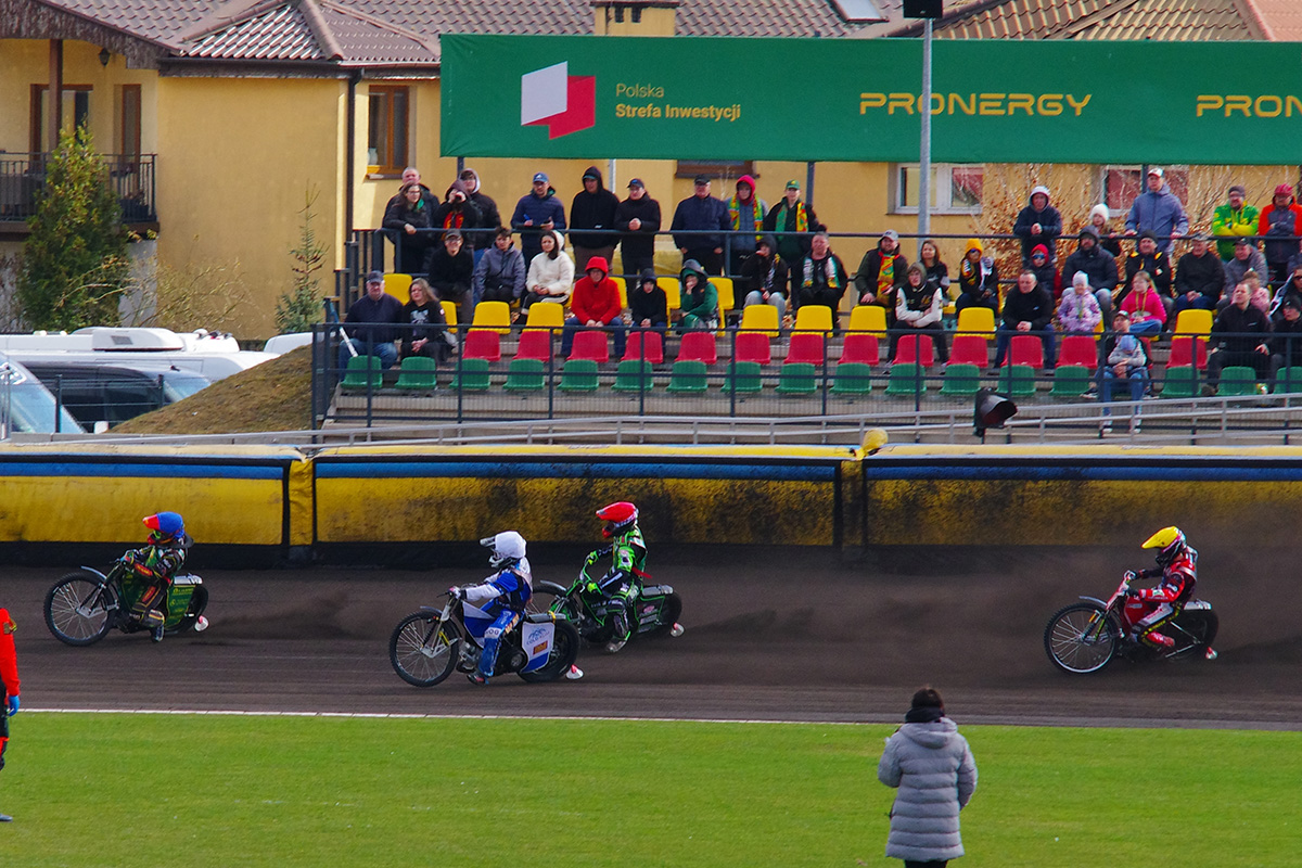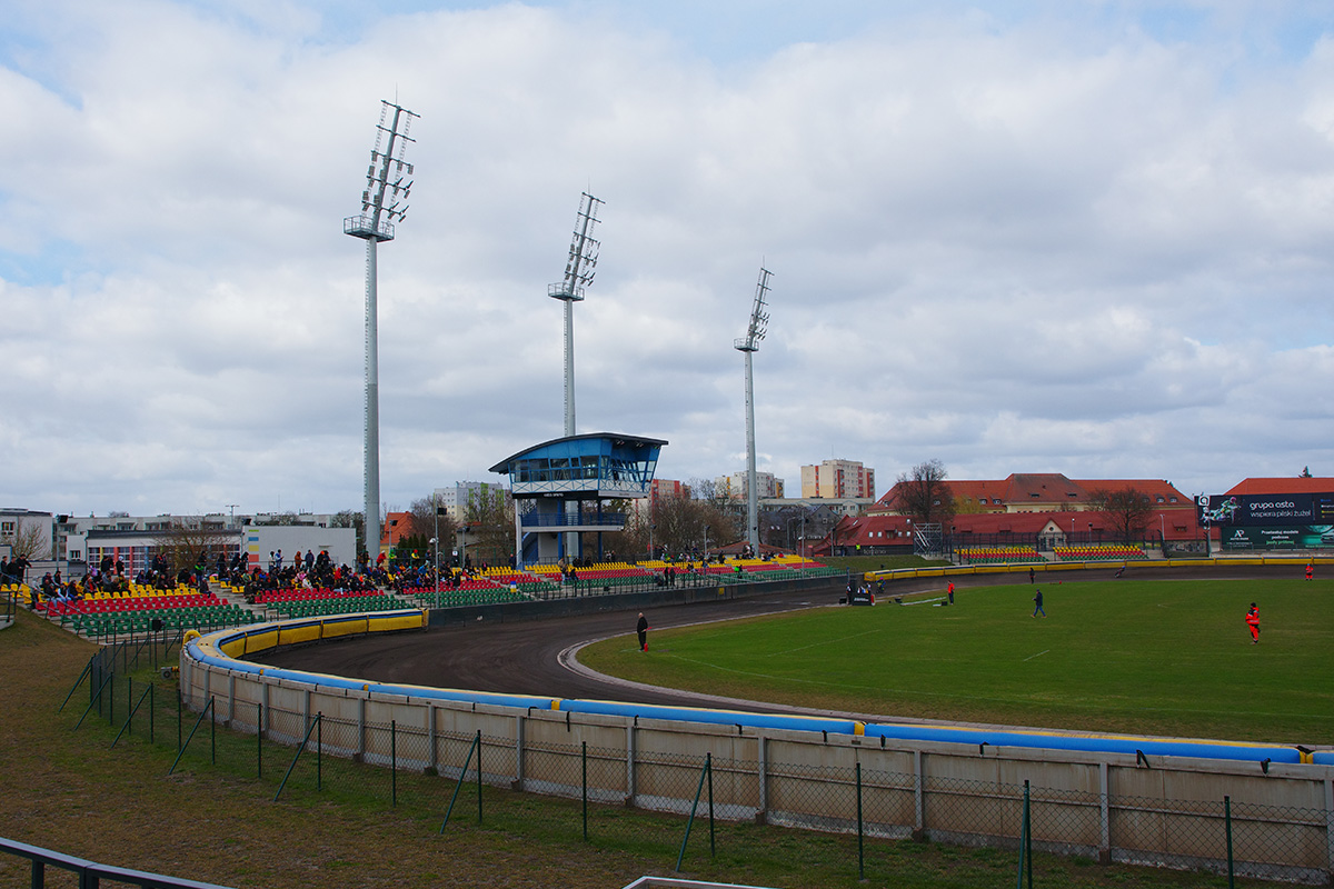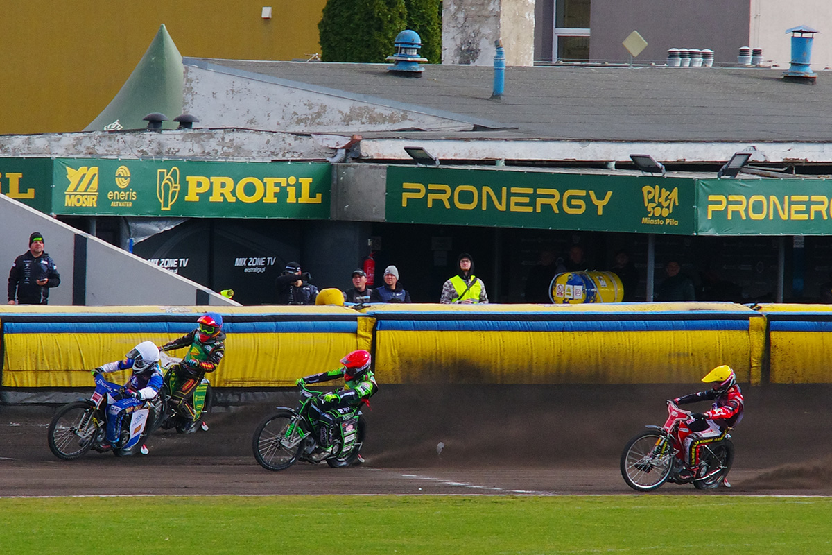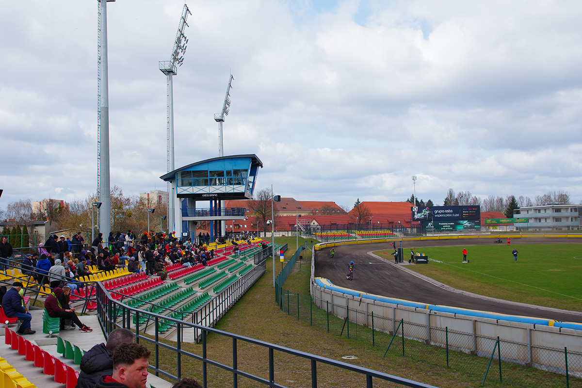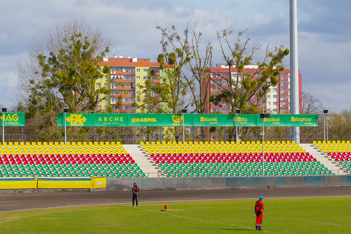 Pilski stadion prezentuje się naprawdę estetycznie. Na trybunach zasiadło trochę kibiców. Wyglądało na wielu, ale jednocześnie trybuny na przeciwległej prostej były zamknięte. Tym, czego (czy raczej kogo) najbardziej zazdroszczę tutejszym kibicom jest spiker Wojciech Dróżdż – klasa sama w sobie. Spokój i merytoryczne podejście.