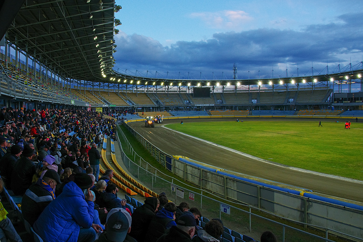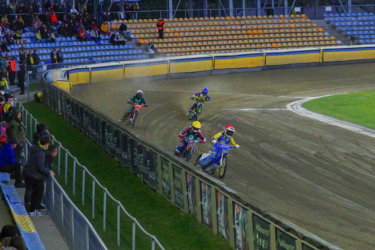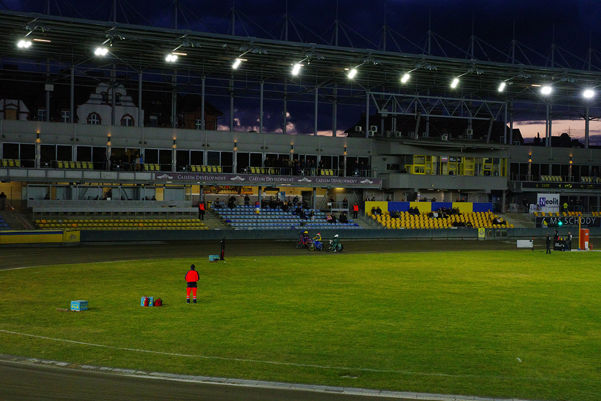 Dla kibiców udostępniono przeciwległą prostą na dolnej trybunie. Okazało się to być w akuratną ilością miejsc. Stanąłem przy barierce na wysokości wejścia w drugi łuk i zacząłem oglądanie tych zawodów. Po wyścigach, których nie widziałem, Falubaz prowadził 11:13, czyli wyglądało na to, że poniedziałkowa porażka u siebie była swego rodzaju wypadkiem przy pracy.